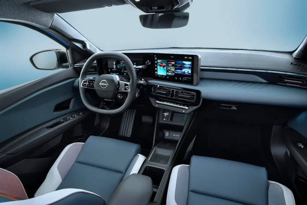 This now EV-only model is offered with two lithium-ion batteries and ranges identical to the Renault 5 E-Tech, namely 40kWh for 192 miles and 52kWh for 253 miles – with motors respectively outputting 120hp and 150hp. A heat pump is standard on both versions and Vehicle 2 Load (V2L) is possible, allowing the battery to plug in external devices including audio speakers, air pumps and more. Charging is a decently quick 30 minutes to get from 15-80% with the 100kW DC charger on the bigger 52kWh version, or 25 minutes from the 80kW DC charger on the smaller 40kWh variant. Nissan’s e-Pedal system for one-pedal driving will feature, steering wheel paddles can adjust levels of regenerative braking and four driving modes – altered via the centre touchscreen – offer Eco, Comfort, Sport and Perso (for personal).