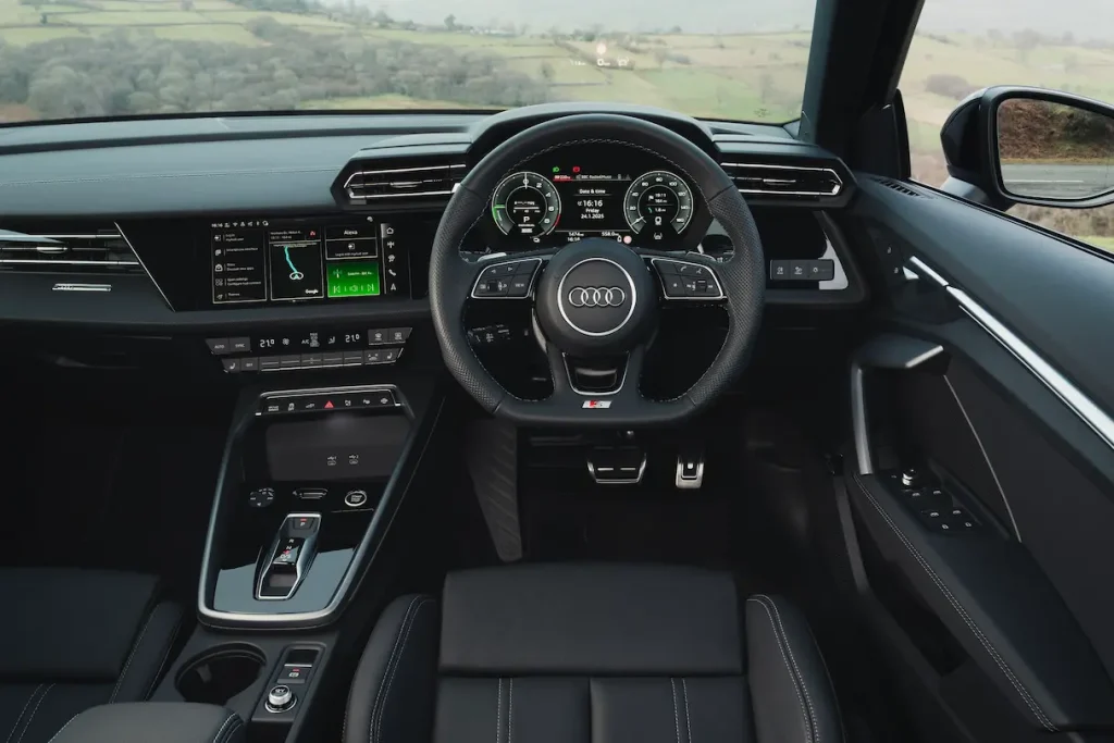 The latest A3 cabin still looks and feels special thanks to a new flat-bottomed three-spoke multifunction steering wheel design, fresh fabrics and inlays, remodelled air vents, and a new dinky S tronic gear shift lever. Equally, the configurable virtual cockpit instrumentation binnacle continues to provide wow-factor in spades as does the sharply focused 10.1in central touchscreen. In general, this main screen works extremely well, thanks to large icons and prominent haptic feedback pulses, although some of the menus are blocked out when resting your hand at certain positions on the steering wheel. Thankfully there are physical switches for the climate controls, and you can execute many commands via an Alexa-style voice communication.