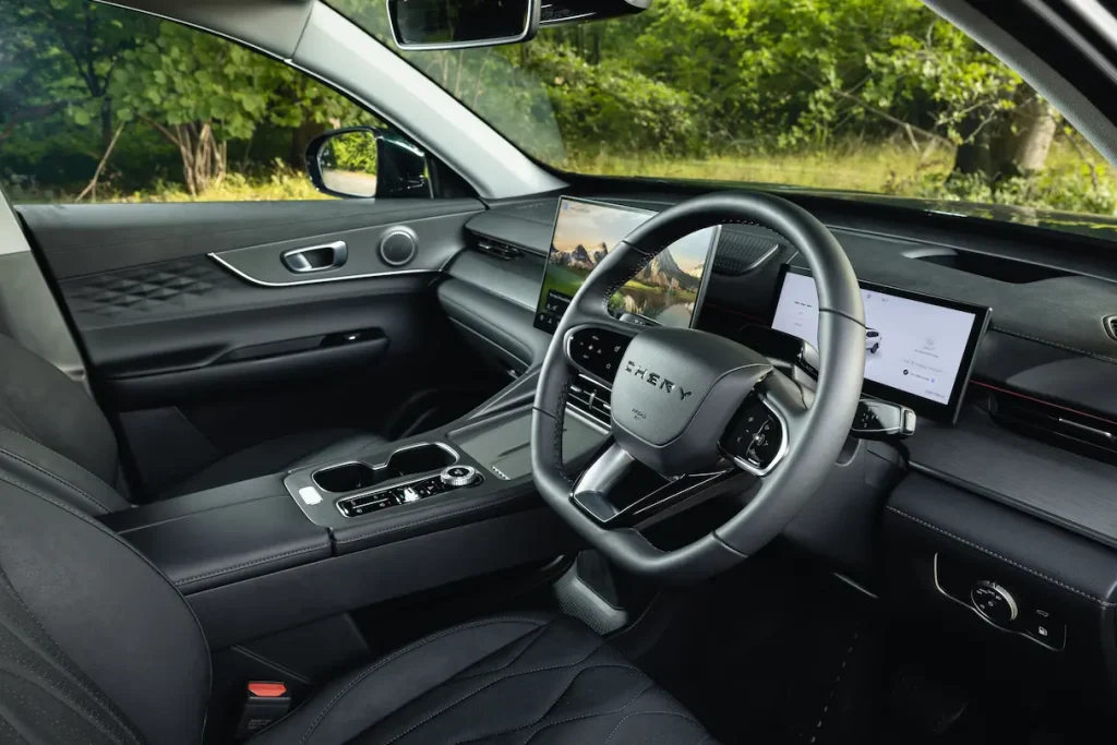 The Tiggo 8’s interior features a standard 15.6in infotainment touchscreen, which is impressively large – in fact arguably too large, since with our driving position the right-hand edge of the screen was obscured by the steering wheel. It also houses too many functions, including temperature and door mirror adjustment, for which we would prefer to have separate physical controls.