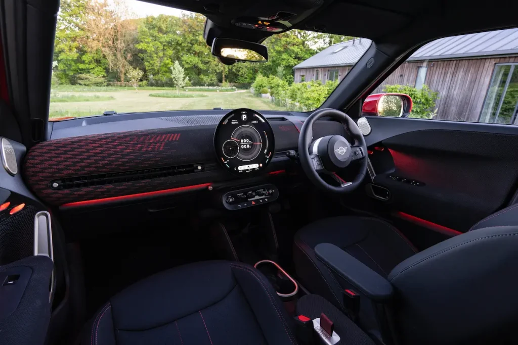Outside, the Cooper in our opinion, is still the best-looking model in the latest Mini range. Although, it’s disappointing that the JCW electric version looks so like the lesser Sport version that’s already on sale. The only differences are the red body kit highlights and brake calliper colour. Also, there’s a chequered flag decal around the rear numberplate, and unique JCW 18in wheels.