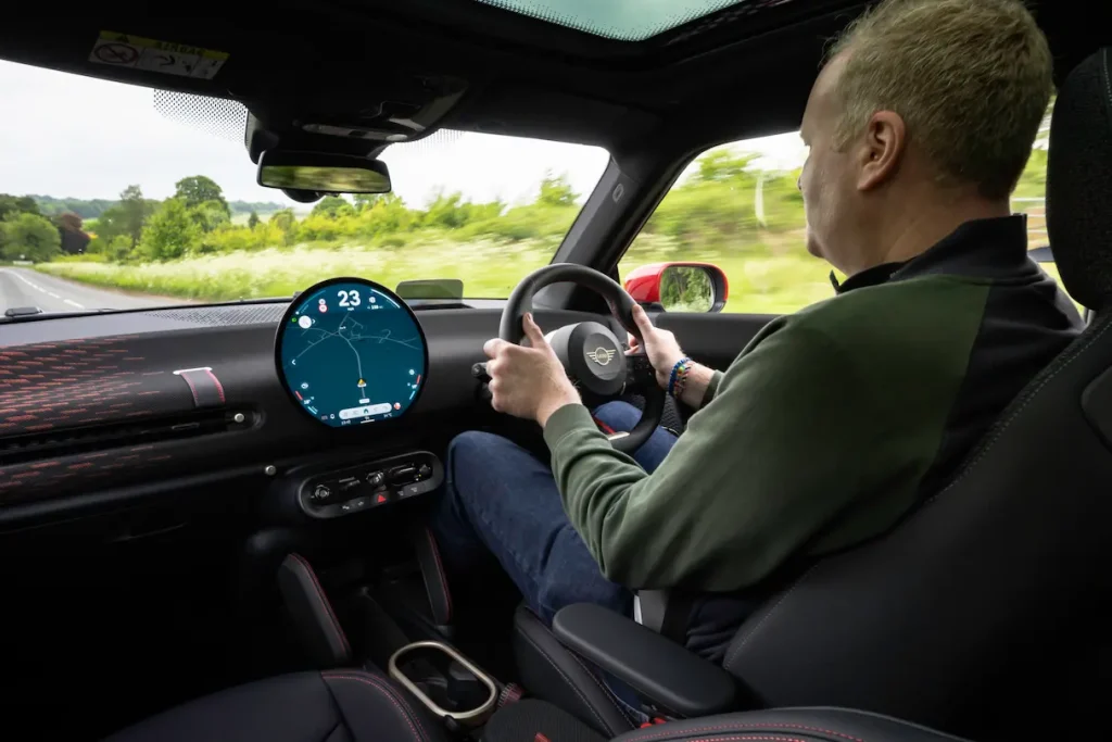 The interior of the JCW Mini, like the exterior, also disappoints by how similar again it is to Sport specification. However, we like the look and feel, which as we’ve said before, is heavily influenced by the original Classic Mini. On top of the attractive, vertically styled, woollen-trimmed dashboard, here with its checkered flag trim, you can’t miss the circular OLED display. It runs the Android-based Mini Operating System 9, with all the functions of the car operated by touch or voice control. Previous experience still tells us there’s a lot going on in a circular screen with a diameter of 240mm. But it is easy to operate, and impressively fast in its operation.