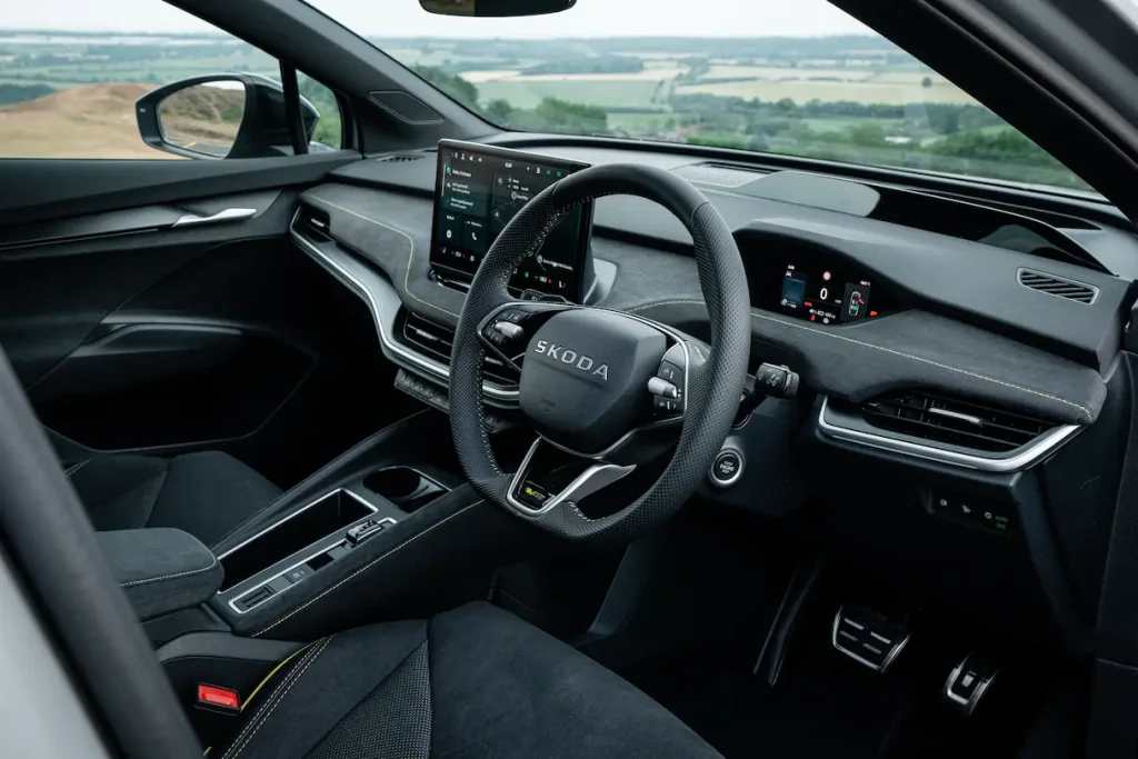 Inside, the sporting feel remains unchanged to the last Enyaq vRS. This vRS adds green stitching to the luxurious feeling microsuede, and artificial leather, that’s fitted throughout and is called the ‘Suite’ set up.
