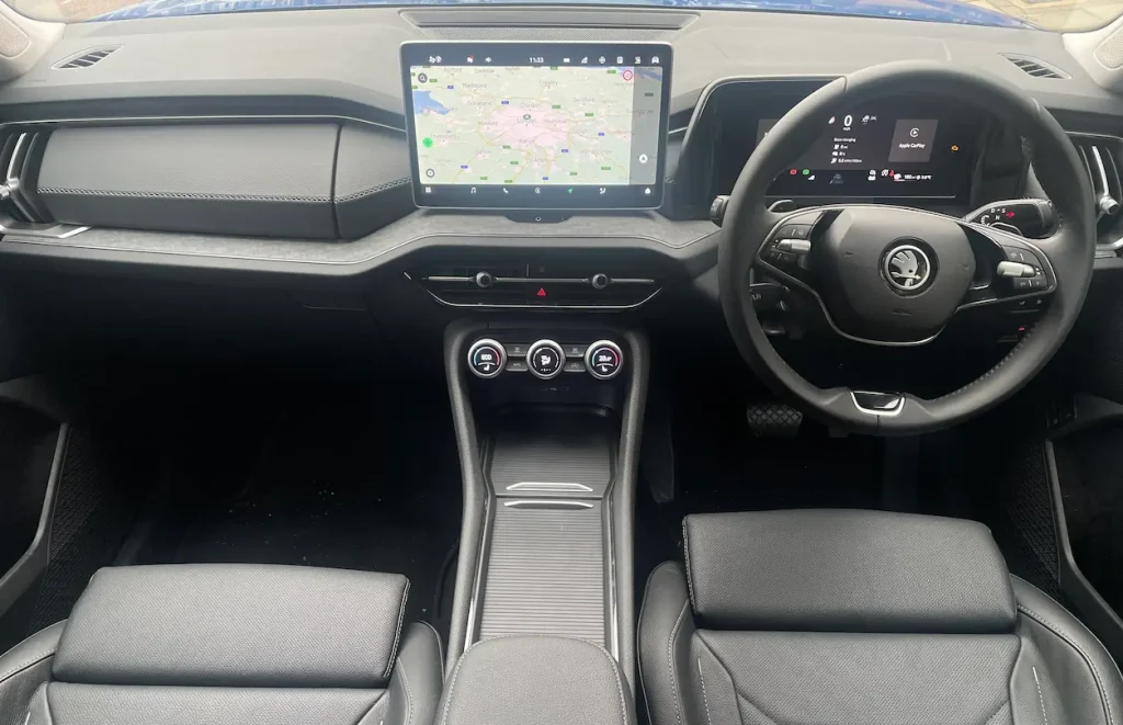 The interior of the Kodiaq feels very much ‘regular VW Group’ in style and execution, but there are some neat and specific details that chime with the Czech brand’s longstanding ‘Simply Clever’ tagline. The twistable auto gear selector has been moved to the right-hand side of the steering column to free-up more central storage and space for two wireless phone charging slots, while door handles are logically placed and easy to locate. There’s also a de-icer inside the fuel filler flap, spatially helpful as well as aesthetically pleasing ambient cabin lighting and easy-to-turn-off speed limit and lane keep bleep warnings only one layer deep within the 13in central touchscreen. Four USB-C ports (x2 front, x2 rear) ensure modern device charging needs are catered for and the vehicle is Apple Carplay and Android Auto-compatible. In real-life use, various family iPhones have easily connected to swiftly provide hands-free messaging, mapping, music and moving back and forth between the in-house screen and Carplay is also a doddle.